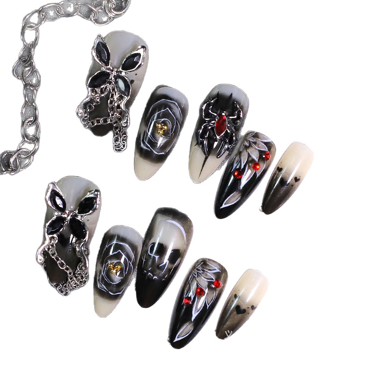 – Red diamond spider: Bright red gemstone metal spider design, visually striking, the focal point of the entire nail set.