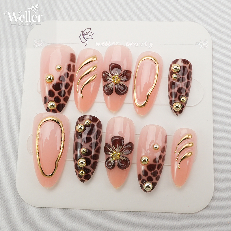 Be the first to review “Leopard Print Almond Press On Nails Brown Flower Gold Metal Decor Fake Nails”