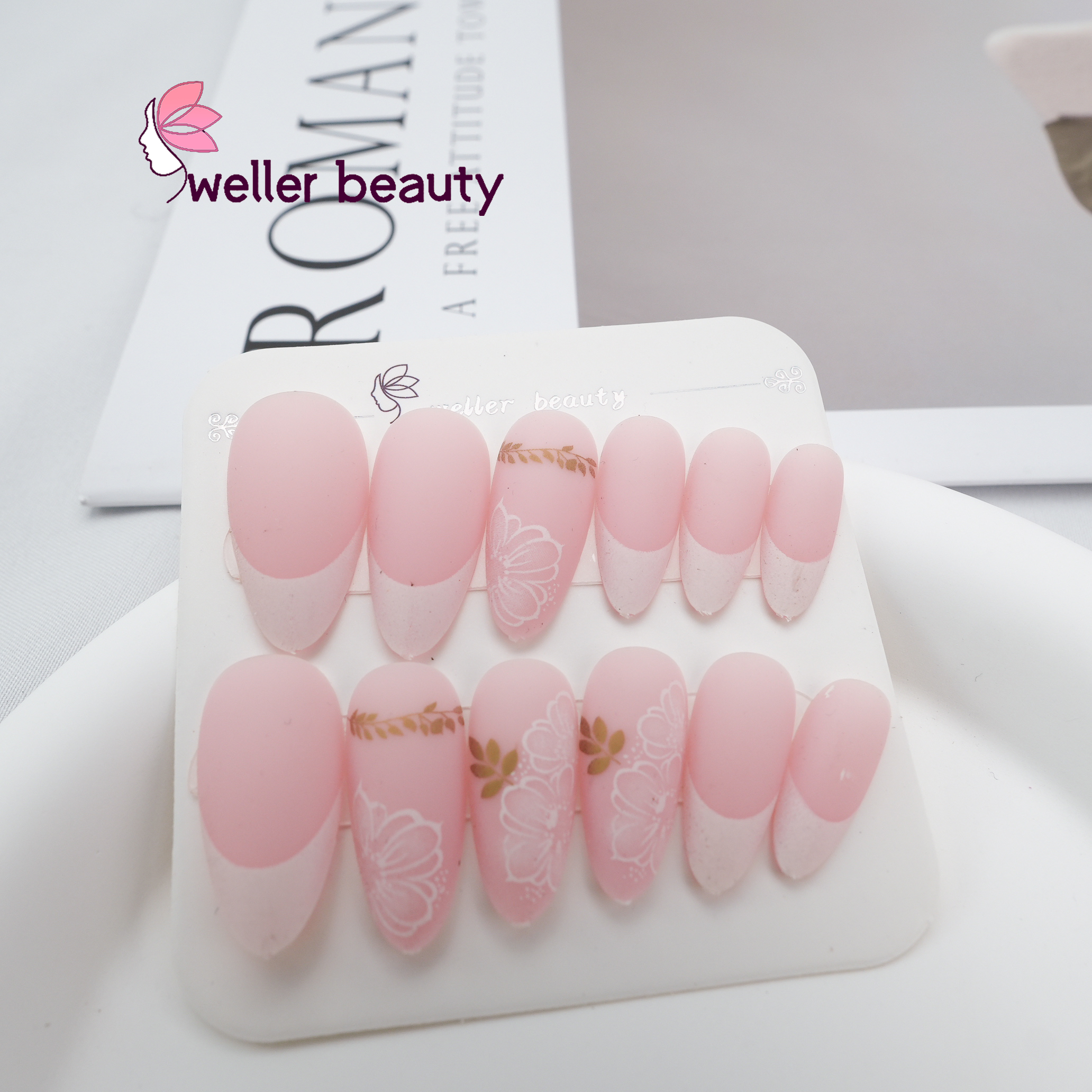 Pink Gradient Flower Press On Nails with Gold Foil & Rhinestones